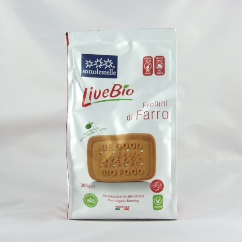 Frollini prodotti in uno stabilimento bio dedicato, con olio extra vergine d'oliva, senza latte e senza uova, dolcificati con sciroppo d'agave per un gusto semplice e sano.