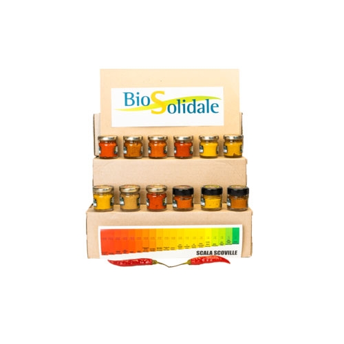 La confezione contiene 3 creme di peperoncini misti (1 crema di peperoncini rossi, 1 crema di peperoncini gialli e 1 crema di peperoncini arancioni) + 9 creme di peperoncino monovarietali con diverso grado di piccantezza. Tutti i peperoncini utilizzati sono coltivati da noi (coltiviamo oltre 200 varietà di peperoncino). Usiamo solo Olio EVO di alta qualità.