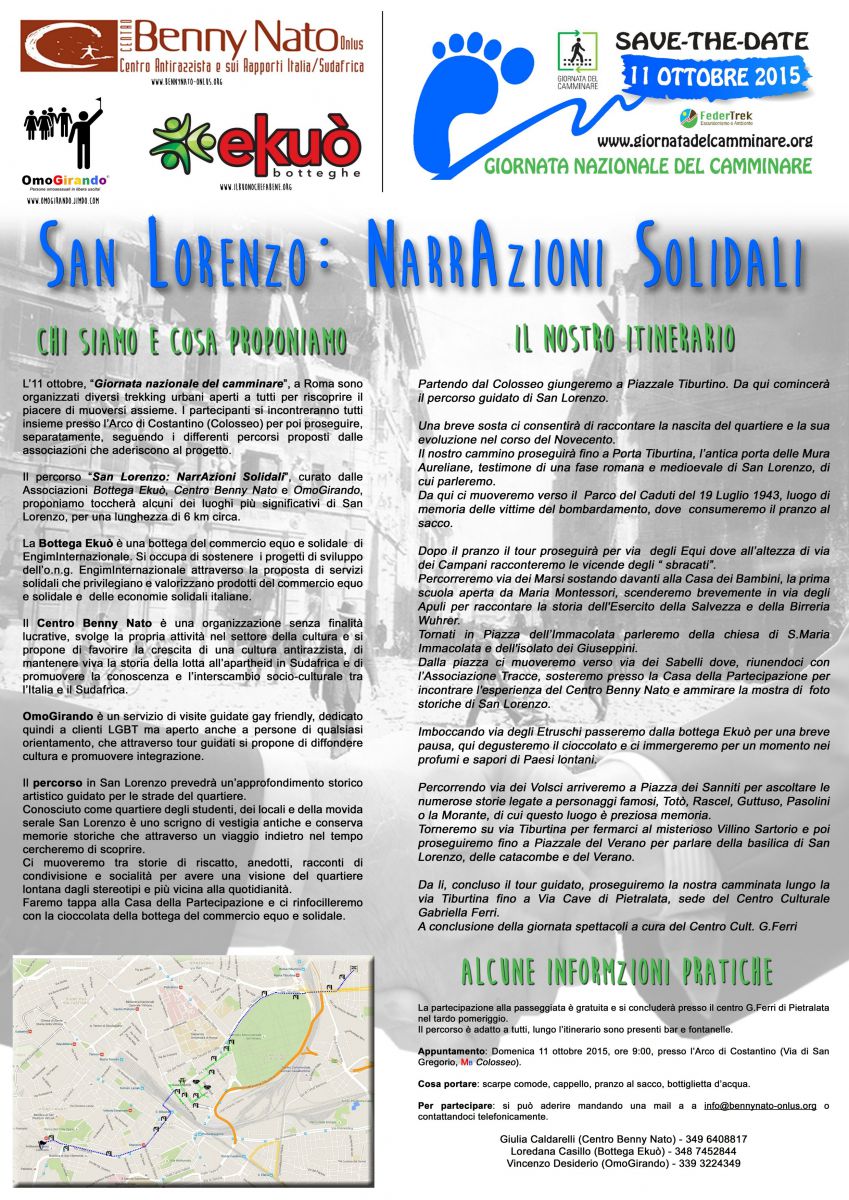 Il Centro Benny Nato insieme alla Bottega Ekuò e OmoGirando aderiscono alla Giornata nazionale del Camminare promossa da FederTrek, con il percorso: “San Lorenzo: NarrAzioni Solidali”. Si partirà dal Colosseo per arrivare a via Cave di Pietralata; ovviamente ci si può inserire in qualsiasi punto del percorso.