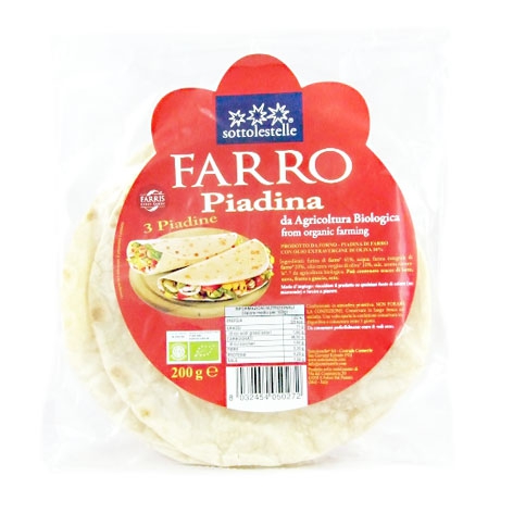 Una straordinaria piadina prodotta con il più antico dei grani: il farro. Realizzata senza lievito, senza strutto e senza grassi animali.
